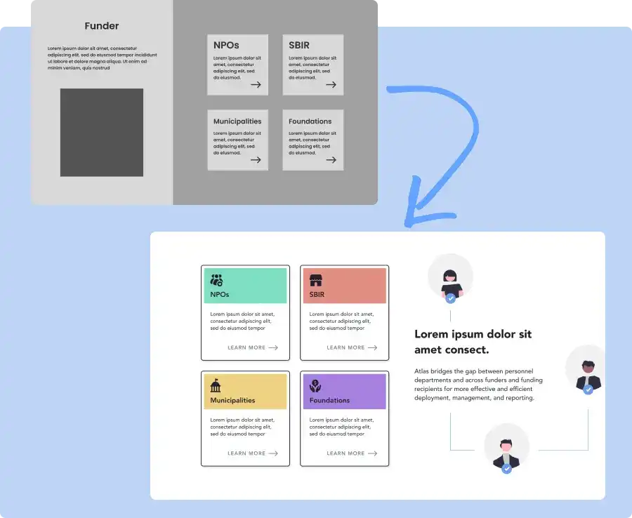 Further user experience designs to expand the product for the funder side of the grant management ecosystem followed by prototyping, user interfaces and high fidelity designs of the product. We also created a marketing website for the product to sell it online